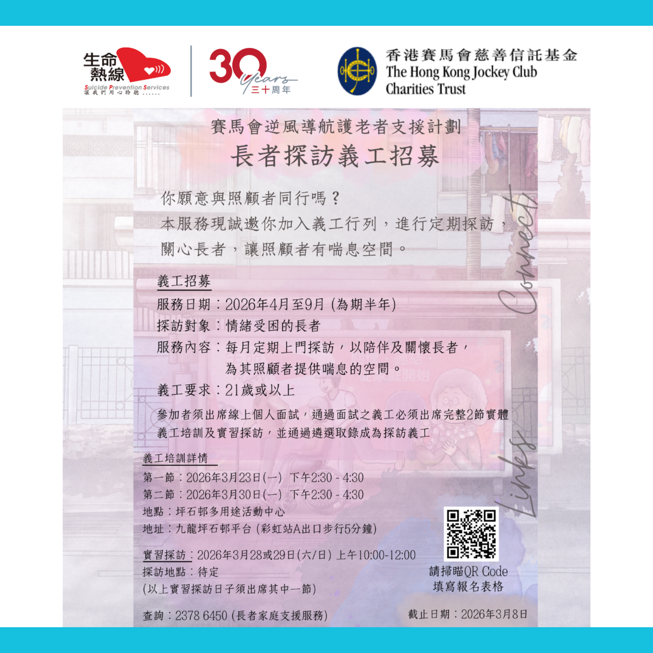 每年,香港平均有超過1,000人自殺身亡,而近年長者自殺比例更佔三成半以上,即平均每天約有一位長者因不同困難和生活壓力而選擇放棄生命。你願意出一分力,關心身邊老友記,以減少長者自殺情況嗎?