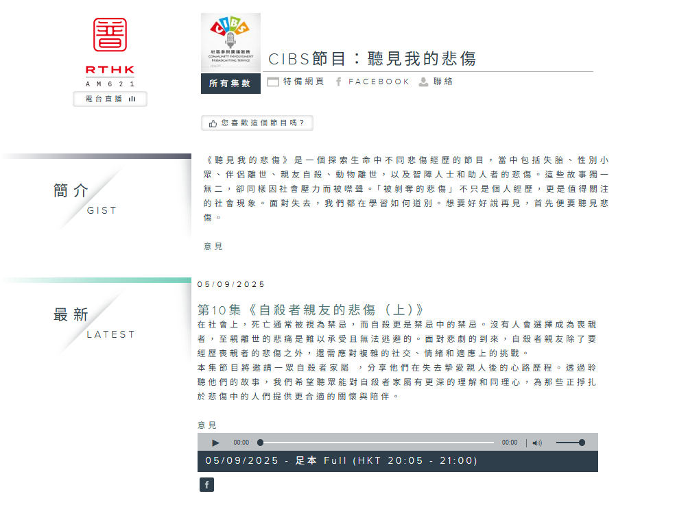 九月份 #香港電台CIBS廣播節目《#聽見我的悲傷》關注自殺者親友的悲傷話題。訪問由 #生命熱線 程序策劃經理 蔡秀玲女士介紹機構為自殺者及突然離世親友之支援服務。#釋心同行,積極活出美好人生!