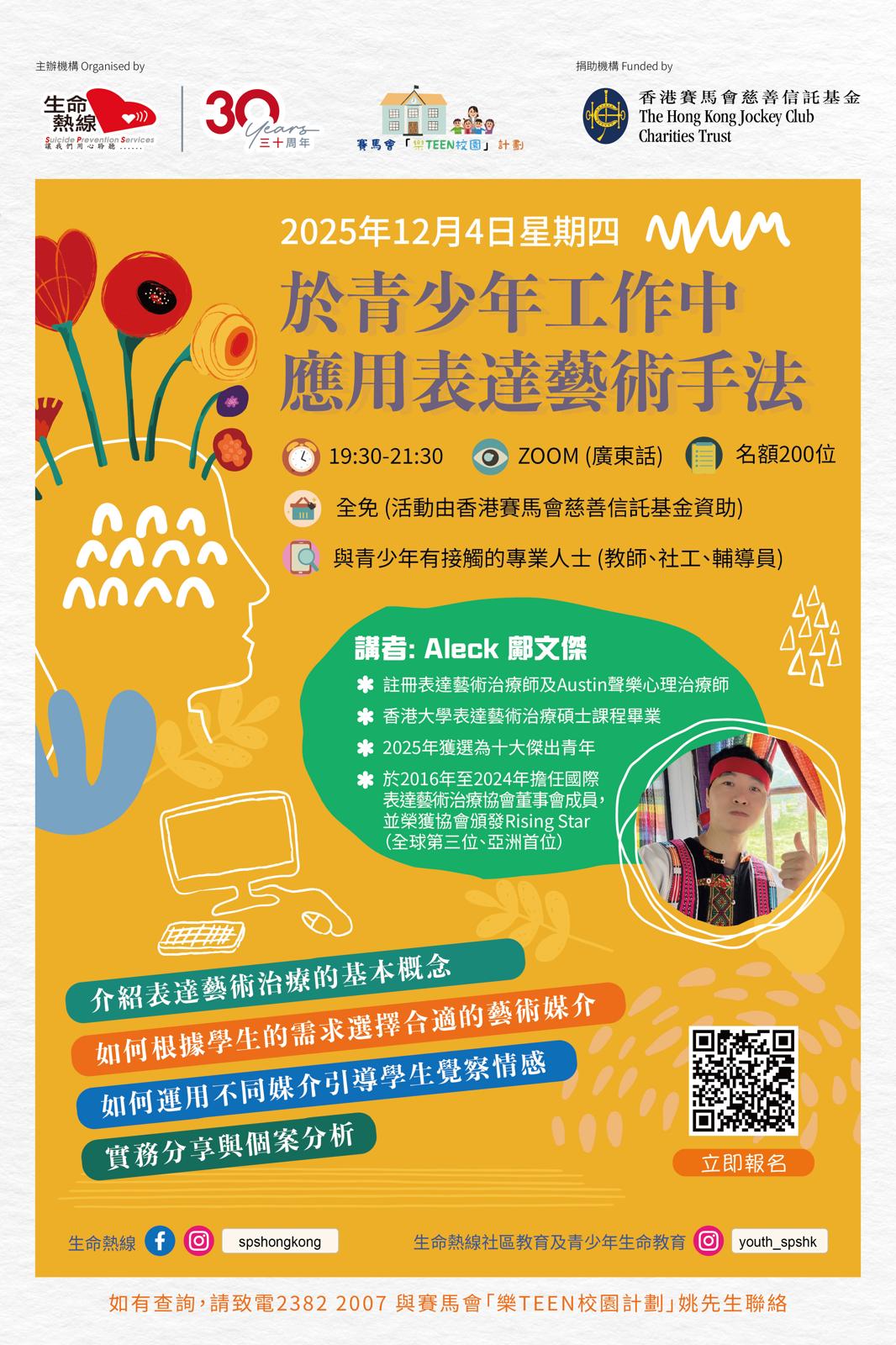 活動詳情:主題: 「於青少年工作中應用表達藝術手法」網上專業培訓講座日期: 2025年12月4日 (星期四)時間: 晚上 7:30-9:30形式:網上 Zoom對象:與青少年有接觸的專業人士 (教師、社工、輔導員、正就讀社工或輔導課程之學生)名額: 200位費用: 全免