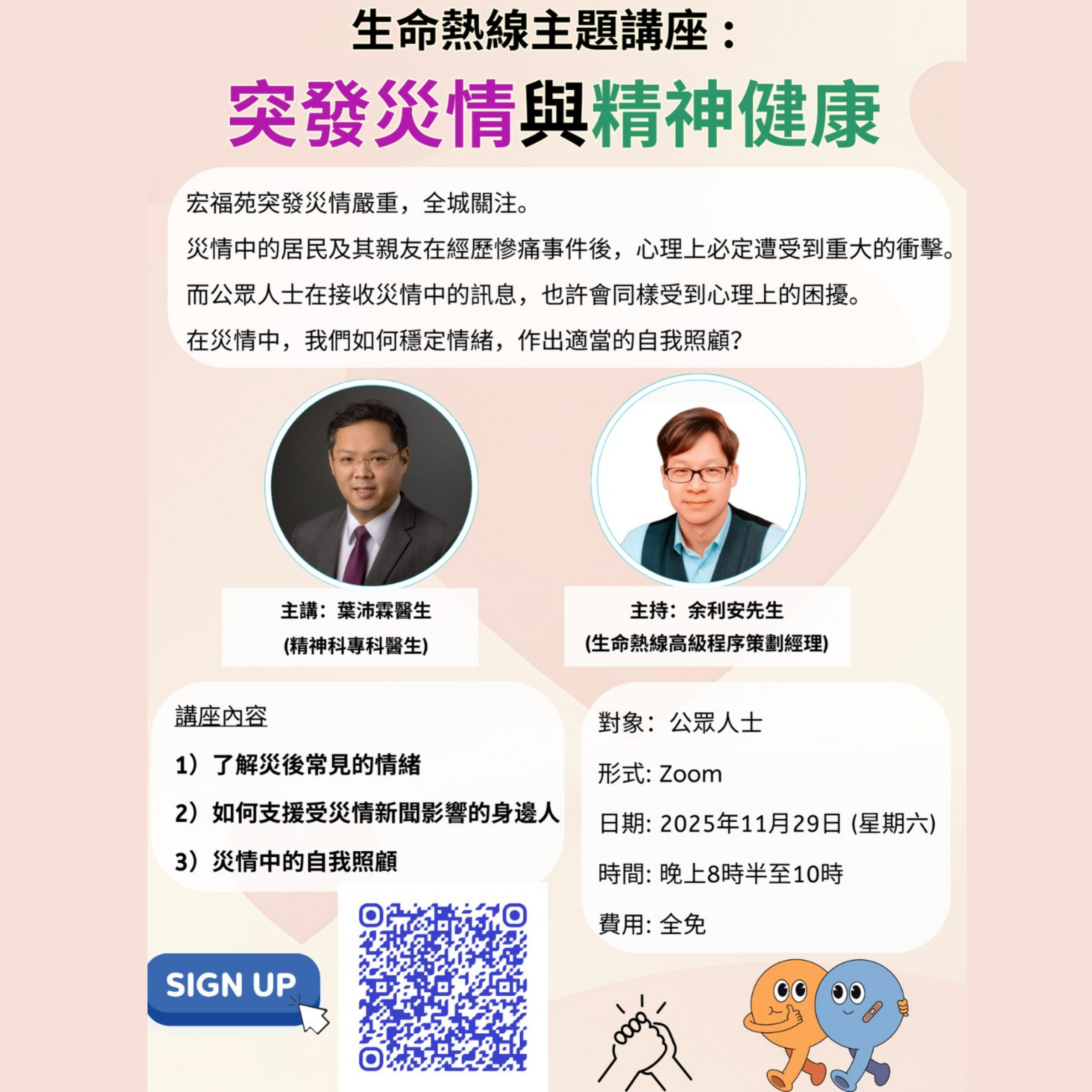 宏福苑突發災情嚴重,全城關注。災情中的居民及其親友在經歷慘痛事件後,心理上必定遭受到重大的衝擊。而公眾人士在接收災情中的訊息,也許會同樣受到心理上的困擾。在災情中,我們如何穩定情緒,作出適當的自我照顧?
