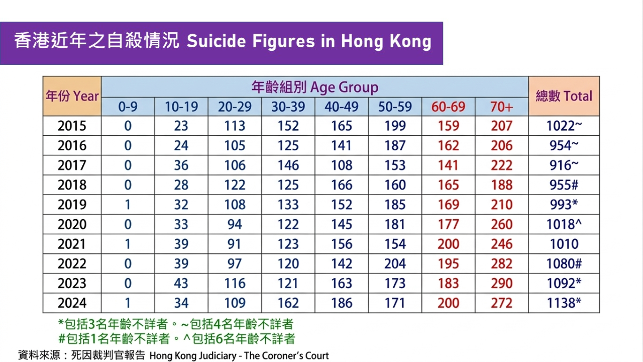 如:講一些暗示性的說話(例如:「我真係無用啦」、「我唔想連累人」……)、表達求死意欲、收集或討論自殺方法……等