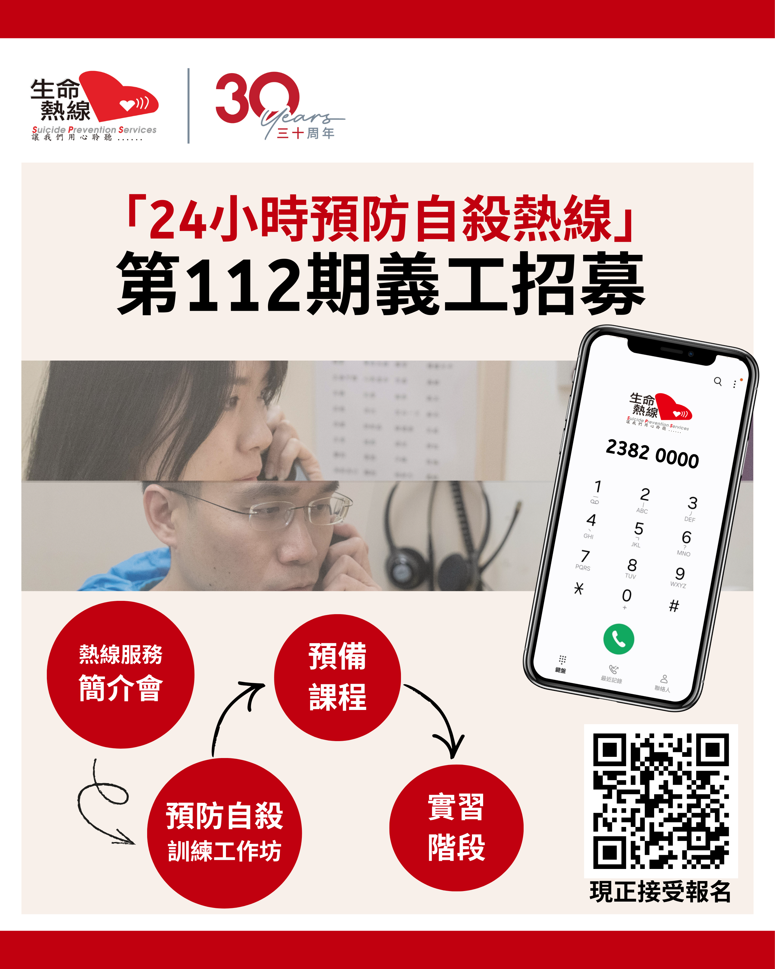 自1995年成立以來,「生命熱線」義工透過電話或親身探訪接觸情緒受困或有自殺風險的人士,本着關懷、聆聽、接納及陪伴的精神,與受助者共度時艱,重拾生命動力。